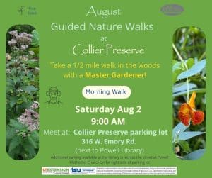 Take a 1/2 mile walk in the woods with a Master gardener! Meet at the Powell Branch Library next door where there is plenty of parking. Additional parking available across he street at Powell Methodist Church on far right side of parking lot.